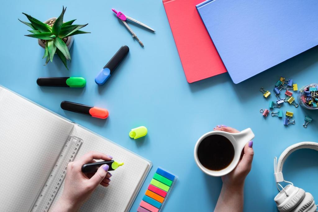 Baue eine Wortbank mit Verben, die Bewegung und Behaglichkeit tragen: schichten, rahmen, erden, dämpfen, verankern. Ergänze Bildwörter für Licht und Schatten. So klingt jeder Text konsequent und wiedererkennbar.